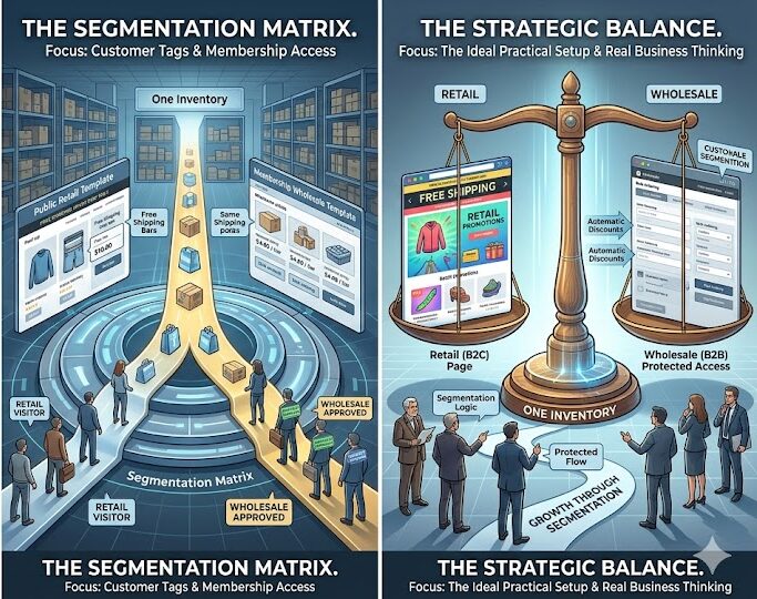 This is exactly the situation many long-established businesses face. A store built entirely for approved wholesalers now wants to add a small retail section for direct customers. The challenge is not simply adding a retail page—it is maintaining the existing wholesale structure while introducing separate pricing, customer experience, and access rules for retail buyers.