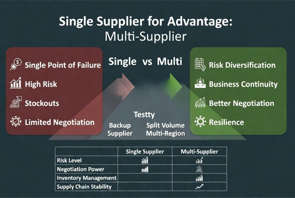| Single Supplier | Simple operations | High risk |